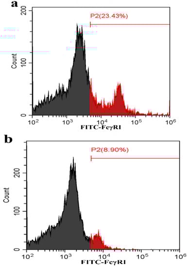 The primary rabbit anti-FcγRI or anti-FcγRIII IgG and the secondary anti-rabbit IgG antibody (FITC-conjugated) were used for the flow cytometry experiment. At 37 °C, PAMs collected were pretreated with rabbit-negative IgG (RNI), rabbit anti-FcγRI IgG, or rabbit anti-FcγRIII IgG at 100 μg/mL concentration for one hour and then incubated with anti-rabbit IgG antibody (1:100 dilution) for one hour. In each step, the cells were washed using PBS buffer containing 3% FBS. A CytoFLEX flow cytometer from the USA Beckman Coulter was used to perform flow cytometry analysis.