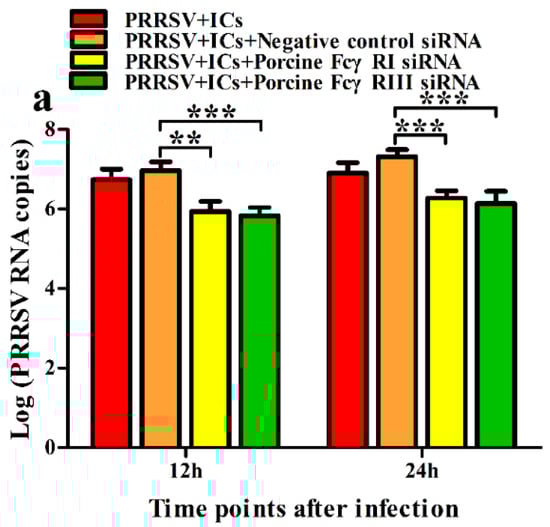 The negative control small interfering RNA (siRNA) and the siRNA used for silencing porcine FcγRI or FcγRIII gene (seen in Table 3) were supplied by the Shanghai GenePharma Corporation in China. 20 pmol of negative control siRNA, FcγRI siRNA, or FcγRIII siRNA was transfected into PAMs cell monolayer (5 × 105 cells) prepared aforehand in 24-well plates by utilizing lipofectamine 2000 reagent (Invitrogen, Beijing, China) for knockdown of the target genes. Between 24–72 h later, the transfected cells were gathered for quantitative RT-PCR, immunoblot, or flow cytometry. Moreover, 48 h post-transfection, 200 μL PRRSV + ICs were used to infect the transfected cells for 12 and 24 h at 37 °C. Then the cell supernatants were harvested for detection of viral RNA and titers.