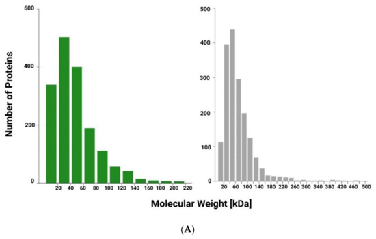 Spirulina platensis and Moringa oleifera are important protein sources due to their high nutritional value protein contents, as confirmed by Bradford assay [39] (protein content > 60% w/w). To determine the protein composition of the Arthrospira platensis and Moringa oleifera extracts, a label-free based liquid chromatography–mass spectrometry (LC–MS/MS) proteomic approach was carried out. Figure 2 shows the distribution of the molecular weight (A), protein sequence coverage (B) and the profile of lengths (C) for all identified peptides in the Arthrospira platensis and Moringa oleifera extracts (Figure 2). The complete list of proteins identified is reported in the Supplementary Materials.
