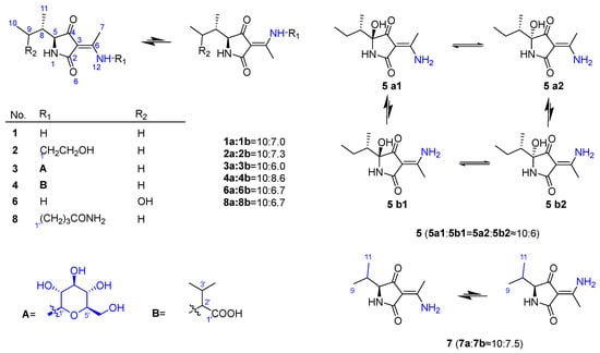 Compound 5 was obtained as brown oil droplets and had the molecular formula of C10H16N2O3, as indicated by the negative quasi-molecular ion peak at m/z 211.1092 [M−H]− (calcd. 211.1083) in (−)-HRMS(ESI). Its 1D NMR data (Table 2 and Table 3) were highly similar to those of 1, but with the absence of the proton signal of CH-5 (δH 3.44/3.53 and δC 64.9/63.6 for 1a and 1b), and in the concomitant presence of non-hydrogen bearing carbon resonances (δC 87.85/87.87 for 5a1 and 5a2, 87.02/87.03 for 5b1 and 5b2, respectively), suggesting the existence of a new substituent at C-5, which was then identified as hydroxyl groups by ESIMS and HMBC spectra (Figure 2). Specifically, the HMBC correlations (Figure 2) from the 1-NH signals at δH 7.70/7.77 (1H, s, 1-NH), 5.60/5.62 (1H, s, 5-OH), and 0.61/0.89 (3H, d, J = 6.9 Hz, H3-11) to the non-oxygenated bearing C-5 (δC 87.9) confirmed that the hydroxyl groups were substituted at C-5 for tautomers 5a1 and 5a2. Given the hemiketal property of the hydroxyl group, the configurations of C-5 were rapidly isomerized, and the isomers existed in the solution in nearly equal quantities. As compared with those of 1a, the relative α-configurations for 5-OHs of tautomers 5a2 and 5b2 were assigned by the up-fielded 13C NMR data for C-8, C-9, and C-11 with more values of ΔδC −1.5, and −4.0 ppm by the γ-gauche effects resulting from the 5α-OHs. Consequently, the 5-OHs of tautomers 5a1 and 5b1 were β-oriented with less values of ΔδC −2.6 ppm for C-11, even down-fielded shift for C-9 (ΔδC +0.3 ppm) resulting in less repulsion of 5-NHs. Similar to compound 1, the Z/E isomerism of carbon–carbon double bonds between the predominant tautomers (5a1 and 5a2) and the minor ones (5b1 and 5b2) in compound 5 was verified by the down-fielded shifts for C-4 (ΔδC +2.3 ppm) and up-fielded shifts for C-2 (ΔδC −2.7 ppm) for 5b1 and 5b2. This was due to the intramolecular hydrogen bond formation for 5b1 and 5b2 between 12-NH with keto functional groups (C-4) rather than between 12-NH with amide carbonyls (C-2). Thus, the chemical structure of the new compound was established, as shown in Figure 1, and it was named tenuazamine E.