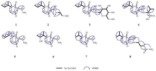 The key COSY (bond lines) and HMBC (blue arrows) correlations of compounds 1–8.