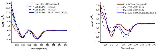 Compound 2 was also obtained as brown oil droplets and had the molecular formula C12H20N2O3, as indicated by the positive ion peak at m/z 263.1359 in the (+)-HRMS(ESI) spectrum ([M+Na]+, calcd. 263.1372). The 1H and 13C NMR spectra of tautomer 2a resembled these of the predominant tautomer 1a in compound 1 (Table 1 and Table 2), with the major differences being the presence of the two additional methylene signals at δC 59.7 (t, C-14) and 44.7 (t, C-13). Considering the molecular formula of 2a, a hydroxyethyl group has to be substituted on the amino group of C-6. Hence, the resulting structure was further verified using detailed 1H–1H COSY correlations between H-1′ (δH 3.40) and NH-12 (δH 10.58), together with the cross-peaks from H2-1′ to C-6 (δC 167.9), and NH-12 to C-1′ (δC 44.7) in the HMBC spectrum (Figure 2), and the up-fielded shift for CH3-7 (δC −4.6 ppm) in 13C NMR data. Similar to compound 1, the Z/E isomerism of carbon–carbon double bonds between the predominant tautomer (2a) and the minor one (2b) in compound 2, was confirmed by the down-fielded shifts for C-4 (ΔδC +2.8 ppm) and up-fielded shifts for C-2 (ΔδC −2.9 ppm) for 2b, [] due to the intramolecular hydrogens bond formation for 2b between 12-NH with C-4 rather than between 12-NH with C-2. The relative configurations of compound 2 were consistent with those of 1, as determined by a comparison of the NMR shifts of the sec-butyl moieties, especially the 13C NMR data of the center carbons C-5 (ΔδC −0.3 ppm) and C-8 (ΔδC +0.2 ppm) and biogenetic considerations. The absolute configurations of 2 were assigned as (5S, 8S, Z for 2a and 5S, 8S, E for 2b) by comparing its experimental and calculated ECD spectra (Figure 3). Therefore, the structure of compound 2 was established, as shown in Figure 1, and it was named tenuazamine B.