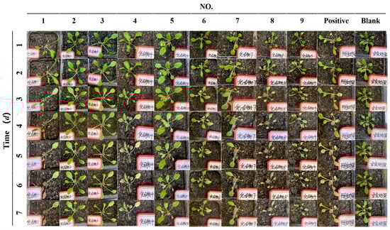 The activity was determined according to the method described by Shi et al. []. All experiments were performed on A. thaliana leaves of the Columbia-0 ecotype 441 (Col-0) at 3 weeks old and were adapted for 24 h at 22 °C ± 0.5 °C in a growth chamber prior to inoculation. By taking 5 µL of a solution containing compounds 1–9, glyphosate (dissolved in methanol, 1 mg/mL), and methanol, and dropping it onto the surface of Arabidopsis leaves, all leaves in each plant participated in the test. Glyphosate and methanol as positive and negative control groups, respectively, were used to compare the changes in Arabidopsis leaves in the experimental group. After adding the medication dropwise, it was placed in a light incubator (22 °C, humidity of 70%, illumination of 2000–3000 lux, photoperiod 14 h/8 h) and observed for 24 h for 7 times.