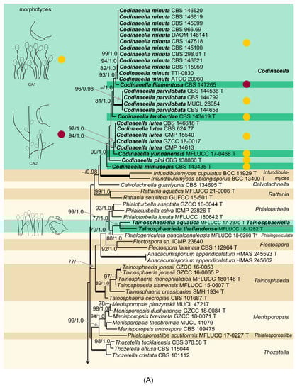 (A) Phylogenetic tree based on the combined ITS-28S-tef1-α rDNA sequences constructed by maximum likelihood (RAxML) of members of the Chaetosphaeriaceae. Species names given in bold and placed in green boxes are taxonomic novelties. Each novelty is accompanied by a respective morphotype(s); their distribution within the genus is indicated by circles of different colors. Codinaea: morphotypes C1 (dark violet), C2 (fuchsia), C3 (lila), C4 (pink); Codinaeella: morphotypes CA1 (yellow), CA2 (burgundy). The clade containing Dictyochaeta s. str. is placed in a violet box. Abbreviations T, E, I, N, and P indicate ex-type, ex-epitype, ex-isotype, ex-neotype and ex-paratype strains; letters in the upper case after a species name indicate: (a) holotype of Chaetosphaeria trianguloconidia, (b) ex-type strain of Codinaea acaciae, (c) ex-type strain of Chaetosphaeria ciliata, (d) ex-type strain of Dictyochaeta curvispora (contamination), (e) ex-type strain of Tainosphaeria obclavata. Thickened branches indicate branch support with ML BS = 100% and PP values = 1.0. Branch support of nodes ≥ 75% ML and ≥0.95 PP is indicated above or below branches. (B,C) Phylogenetic trees based on the combined ITS-28S-tef1-α rDNA sequences of the Chaetosphaeriaceae (continued). For legend refer to (A). Abbreviation: p.p. after a genus name (pro parte).