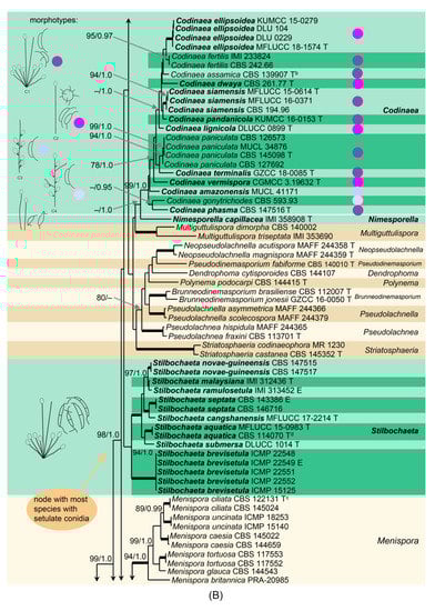 Note: In the three-gene phylogeny (Figure 2), Codinaea is shown as a strongly supported monophyletic clade. Based on the results of the phylogenetic analysis, the generic concept of Codinaea was emended and 14 species were accepted in the genus; the inclusion of 13 species was verified with DNA data. The teleomorph of Codinaea is unknown. Although we were not successful in recollecting C. aristata, we analyzed seven other species that match the Codinaea s. str. Morphotype in all details, i.e., dark brown, thick-walled central seta or setae arranged in a fascicle with shorter, paler, and thinner-walled conidiophores bearing terminal phialides and falcate, aseptate, hyaline conidia with setulae at each end. All seven species of the C. aristata morphotype clustered in the Codinaea clade, namely C. assamica, C. fertilis, C. pandanicola, C. paniculata, C. phasma, C. siamensis, and C. terminalis.