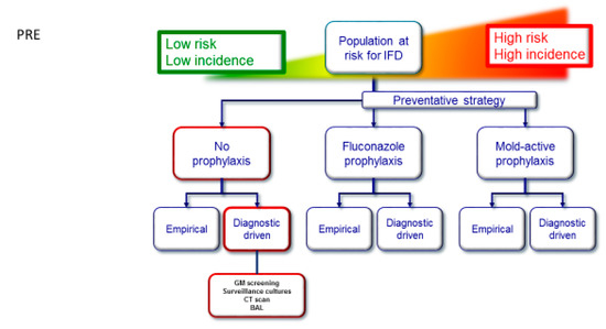 Radboudumc diagnostic driven pathway with a lower at-risk population for IA; pathway follows red tiles. Pre: before this analysis, using no standard antifungal prophylaxis. Post: after this analysis, alternative using standard fluconazole prophylaxis and targeted serum GM only to confirm suspected IA. This figure was adapted with permission from Agrawal et al. [8].