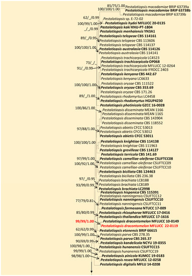 The combined alignment (ITS, tef1-α, and tub2) of Pestalotiopsis comprised 146 taxa, including 5 outgroup taxa. The best-scoring ML tree (Figure 1) had an ML optimization likelihood value of −16,987.384789. There were 1,025 distinct alignment patterns with 26.01% undetermined characters or gaps. The estimated base frequencies were as follows: A = 0.238425, C = 0.294335, G = 0.217098, and T = 0.250142; substitution rates, AC = 1.142015, AG = 3.088078, AT = 1.117450, CG = 0.907663, CT = 4.297777, and GT = 1.000000; gamma distribution shape parameter α = 0.286165; and tree length = 1.911747. The MP analysis for the combined dataset had 576 parsimony-informative, 1389 constant, and 259 parsimony-uninformative characters and yielded the single most parsimonious tree with the parameters TL = 2471, CI = 0.492, RI = 0.791, RC = 0.389, and HI = 0.508. The Bayesian analysis calculated the average standard deviation of split frequencies at the end of 15,000,000 MCMC generations with a stop value of 0.009. The ML, MP, and BI trees were similar in topology. The resulting phylogenetic tree from the concatenated alignment resolved our Pestalotiopsis isolate into a novel host record, P. dracontomelon (MFLUCC 22-0119), with strong statistical support (99% ML, 99% MP, 1.00 PP) (Figure 1).