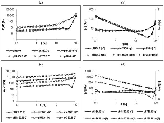 Based on the values of G’, G”, |η*|, and tan(δ) at 1 Hz (Table 4), it can be concluded that both pH and NaCl concentration have a significant effect on the variance of the parameters. The effect of decreasing the pH for the samples induced without salt on the values of G’ and G” was nonsignificant. However, when the samples were induced with 0.15 M NaCl, both moduli values were increased when the pH dropped from 7 to 4.5. In the case of hydrogel induction with the addition of 0.3 M NaCl, the change from pH 7 to 3 significantly increased the values of G’ and G” (reaching the highest values at pH 3). Additionally, at pH 3, the increase in the NaCl addition from 0 to 0.15 M caused the moduli to increase by 95 times on average, while the increase from 0 to 0.3 M caused the moduli to increase by 170 times. Zhu et al. [16] studied strong and elastic pea protein hydrogels formed using the pH-shifting method. They found that this method altered the protein chain structure, creating more active sites that enhanced intermolecular interactions. Moreover, studies on the impact of citric acid concentration and pH on the mechanism and rheological properties of whey protein hydrogels concluded that the induction of protein hydrogel at a low pH value affected the formation of the gel network, resulting in a more rigid hydrogel [62]. Furthermore, Tanger et al. [5], in their study on the effect of pH and ionic strength on the thermal gelation behavior of pea protein, noticed that the addition of salt at pH 3 led to the development of a stiffer gel structure caused by a high entanglement of the protein. The degree of viscoelasticity, tan(δ), is defined as the ratio of G”/G’. When the analyzed systems exhibit solid-like (elastic) properties, tan(δ) is lower than 1. However, for systems with more liquid-like (viscous) properties, tan(δ) is higher than 1 [63]. In the case of the obtained hydrogels, all the variants had a tan(δ) value lower than 1 at at 1 Hz, ranging from 0.24 to 0.29, meaning that the formed hydrogels left at rest have properties similar to a solid but can be easily spread, such as yogurts, ketchup, and jams.