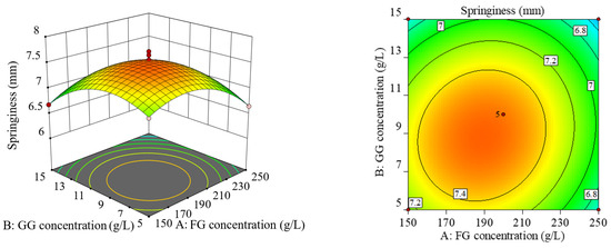 It can be seen from Table 2 that the F-value of the model was 32.87 and the p-value was less than 0.001, indicating that the model was highly significant. The p-value of the lack-of-fit term was 0.9716 > 0.05, indicating that the effect of the extra-experimental factors was not significant. The Predicted R2 of 0.9466 is in reasonable agreement with the Adjusted R2 of 0.9472, indicating that this model was highly credible. A, B and C had significant effects on the springiness of the flexible hydrogel (p < 0.05), among which A and B reached highly significant levels (p < 0.01). The secondary terms A2, B2 and C2 reached highly significant levels (p < 0.01), and AC and BC reached significant levels (p < 0.05). The influence order of each factor was A > B > C, i.e., FG concentration > GG concentration > Fe2(SO4)3 concentration.