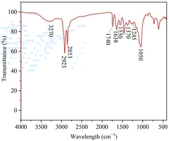 The IR spectra of HAS are shown in Figure 1. The peak near 3270 cm−1 is the stretching vibration of N-H in the amide group. The peaks near 2923 cm−1 and 2853 cm−1 correspond to the antisymmetric and symmetric stretching vibration of C-H, respectively. The peak near 1740 cm−1 corresponds to the C=O stretching vibration of the ester group. The corresponding peak near 1638 cm−1 is the stretching vibration peak of C=O in the amide group. The corresponding peak near 1550 cm−1 is the bending vibration peak of N-H, and the peak near 1370 cm−1 corresponds to the bending vibration peak of C-H. The peak near 1245 cm−1 corresponds to the stretching vibration peak of C-C. The peak near 1050 cm−1 corresponds to the stretching vibration peak of C-N.