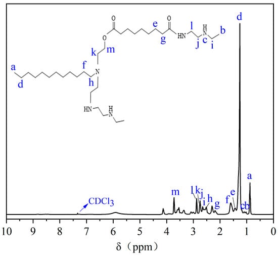The 1H NMR results of HAS in CDCl3 are shown in Figure 2. Peak a (0.88 ppm) is the proton peak of -CH3 at the end of dodecylamine polyoxyethylene ether. Peak b (1.11 ppm) is the proton peak of -CH3 in the N-ethyl ethylenediamine, and peak c (1.15 ppm) is the proton peak of -NH in N-ethyl ethylenediamine. Peak d (1.26 ppm) is the proton peak of -CH2 in the -CH3CH2 for dodecylamine polyoxyethylene ether, and peak f (1.60 ppm) is the peak of -CH2 in the -CH2CH2N for dodecylamine polyoxyethylene ether. Peak e (1.40 ppm) is the proton peak of -CH2 for nonanedioic acid. Peak g (2.19 ppm) is the proton peak of -CH2 in the structure of -CH2COOH for azelaic acid. Peak h (2.50 ppm) is the proton peak of -CH2 in the structure of -CH2N for dodecylamine polyoxyethylene ether. Peak i (2.66 ppm) is the proton peak of -CH2 in the structure of -CH3CH2 for N-ethyl ethylenediamine, and peak j (2.71 ppm) is the proton peak of -CH2 in the structure of -CH3CH2NHCH2 for N-ethyl ethylenediamine. Peak k (2.74 ppm) is the proton peak of -CH2 in the structure of -CH2CH2OH for dodecylamine polyoxyethylene ether. Peak l (2.81 ppm) is the proton peak of -CH2 in the structure of -CH2NH for N-ethyl ethylenediamine. Peak m (3.68 ppm) is the proton peak of -CH2 in the structure of -CH2OH in dodecylamino polyoxyethylene ether, and the peak (7.26 ppm) is the solvent peak of CDCl3. 1H NMR outcomes indicated the successful preparation of HAS.
