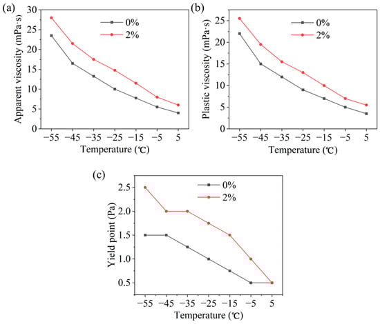 From Figure 3, after adding 2% HAS, the viscosity increased at different temperatures, but the increase was small, with a plastic viscosity of only 25.5 mPa·s at −55 °C. Concurrently, the yield point increased from 1.5 Pa to 2.5 Pa at −55 °C, indicating that HAS significantly enhanced the rheological performance and provided a guarantee for the cuttings carrying capability of drilling fluid.