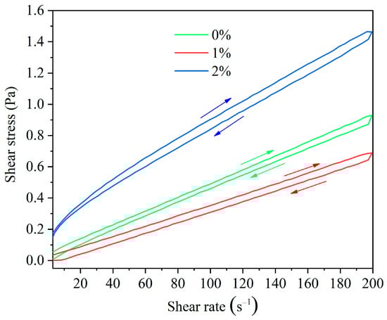 Thixotropy: The thixotropic loop area was tested by HAAKE rheometer. Firstly, the variation curve of shear stress with the increase in shear rate (0 to 200 s−1) was tested by controlling the program. Secondly, the shear stress variation curve obtained by decreasing shear rate (200 to 0 s−1). The thixotropy was evaluated by calculating the area enclosed by these two curves. The area of the thixotropic loop is automatically calculated by the HAAKE rheometer (Thermo Fisher Scientific, Waltham, MA, USA), and the unit is pa/s. The drilling fluid was cooled at −55 °C for 16 h and tested at 4 °C.