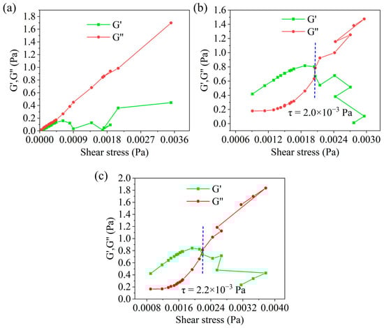 The modulus includes the elastic modulus (G′) and the viscous modulus (G″). Their relative magnitudes can indicate the structure strength of drilling fluids. From Figure 6a, when no HAS was added, the modulus was primarily dominated by the viscous modulus (G″), indicating that the drilling fluid behaved mainly as a viscous fluid. However, for the drilling fluid with 1% HAS, when the shear stress was below 2.0 × 10−3 Pa (Figure 6b), the elastic modulus exceeded the viscous modulus, suggesting that it behaved as an elastic fluid with a higher structural strength. Furthermore, 2% HAS further increased the shear stress value dominated by elastic modulus (Figure 6c). It was analyzed that the polar groups in HAS formed a network structure with hydroxyl groups in organoclay through hydrogen bonding, which enhanced the internal structural forces of the drilling fluid, ultimately leading to elastic fluid behavior.