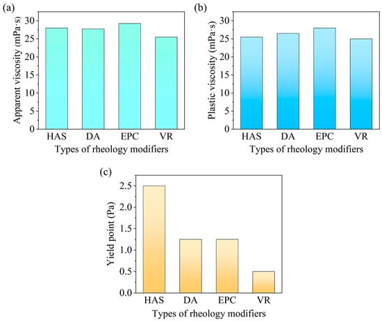 Performance comparison of different rheology modifiers ((a) apparent viscosity; (b) plastic viscosity; (c) yield point).