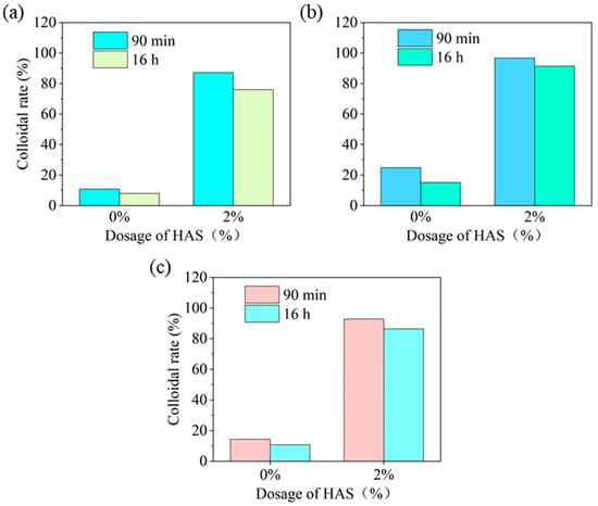 Colloid ratio is an important standard to measure the dispersion stability of drilling fluid. The dispersion stability directly determines drilling fluid’s wettability. The excellent wettability of drilling fluid is an important feature of weak gel grid structure, and the colloid rate serves as a key method for assessing the wettability [,,]. The influence of HAS in base oil on the colloid rate was studied at −55 °C (Figure 9).