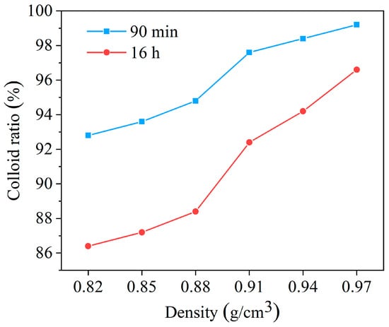 From Figure 11, as the density improved continuously, the colloid rate showed a gradually increasing trend. In addition, the colloid rate remained above 92.4% while the density was 0.92~0.95 g/cm3, indicating excellent colloid stability and good compatibility between HAS and drilling fluid under different density conditions.