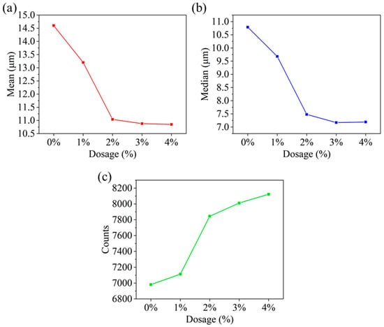 As the HAS dosage improved, the mean and median of the particles decreased continuously. Among them, 2% HAS reduced the particle mean from 14.6 μm to 11.04 μm, and the median from 10.79 μm to 7.48 μm. In addition, the particle counts increased from 6981 to 7844. It was shown that HAS interacted with the organoclay particle by forming hydrogen bonds, which in turn prevented particle aggregation, making an improvement in particle counts and a diminishment in particle size [,].