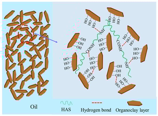 To vividly describe the action mechanism for HAS in drilling fluid, a schematic diagram is shown into Figure 15. As shown in the figure, the HAS molecule has a lipophilic long carbon chain and polar groups such as amide and imine groups, which gives it an amphiphilic structure. The lipophilic long carbon chain makes it stretch in the base oil, while multiple polar groups enable it to form a weak gel grid structure with organoclays particle through hydrogen bonding. In addition, HAS can also form intermolecular forces through interactions such as intermolecular entanglement. The above combined effect enables organoclays particle to maintain long-term stability in base oil, thereby obviously enhancing the wettability and rheology of drilling fluid.