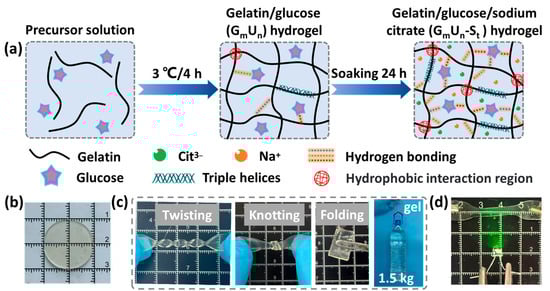 Gelatin, glucose, and sodium citrate (≥98%, SC) were supplied by Shanghai Aladdin Biochemical Technology Co., Ltd. (Shanghai, China). All chemical reagents were used directly for the preparation of hydrogels without further purification. Millipore deionized water was used in all experiments.