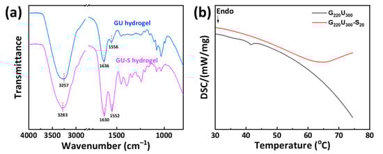 (a) FTIR spectra of G220U300 and G220U300-S20 hydrogels. (b) DSC curves of G220U300 and G220U300-S20 hydrogels.