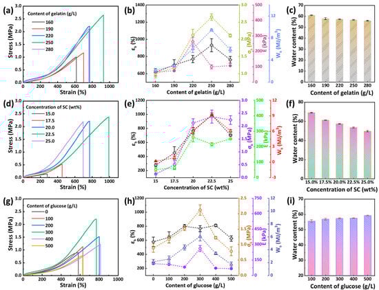 (a) Tensile stress–strain curves of GmU300-S20 hydrogels with different gelatin contents, (b) corresponding mechanical properties, and (c) their water content. (d) Tensile stress–strain curves of G220U300-St hydrogels with different SC concentrations, (e) corresponding mechanical properties, and (f) their water content. (g) Tensile stress–strain curves of G220Un-S20 hydrogels with different glucose contents, (h) corresponding mechanical properties, and (i) their water content.