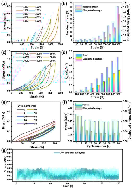 In addition, we also investigated the mechanical properties of the gel through cyclic experiments. A series of cyclic loading–unloading tests was performed on hydrogel of G220U300-S22.5, with the maximum strain ranging from 10% to 500% (Figure 4a,b). As the maximum strain increased from 10% to 50%, the residual strain and dissipated energy increased from 0.13% and 0.17 kJ/m3 to 5.3% and 3.7 kJ/m3, respectively. The loading and unloading curves nearly overlapped, indicating lower energy dissipation. However, as the maximum strain further increased from 100% to 500%, the residual strain and dissipated energy significantly increased from 10.1% and 12 kJ/m3 to 81.3% and 560 kJ/m3, respectively. The hysteresis loop in the stretching cycle process also gradually increased. This pronounced hysteresis was attributed to the intrinsic viscoelasticity of the polymer network []. To further investigate the energy dissipation behavior, a continuous cyclic loading–unloading test was conducted on a single G220U300-S22.5 hydrogel, with the maximum strain ranging from 100% to 900% (Figure 4c,d). The total toughness (Ue) and dissipated energy at different strain were analyzed. With increasing applied strain, the hysteresis loops became progressively larger, demonstrating an increase in dissipated energy. This behavior indicated the disruption of multiple dynamic physical interactions within the hydrogel network. The significant overlap between adjacent loading–unloading curves suggested that some disrupted physical interactions can be rapidly reconstructed during unloading, demonstrating the hydrogel’s rapid self-recovery capability. In addition, 80 consecutive loading–unloading cycles were performed on G220U300-S22.5 hydrogel at a fixed maximum strain of 200% (Figure 4e,f). The variations in maximum stress and energy dissipation gradually decreased after around the 10th cycle, indicating that the hydrogel structure had stabilized under repeated large deformations. Furthermore, after 100 loading–unloading cycles with a maximum strain of 20%, the cyclic stress–strain curves remained nearly unchanged (Figure 4g), demonstrating the hydrogel’s excellent fatigue resistance and structural stability at low strain.