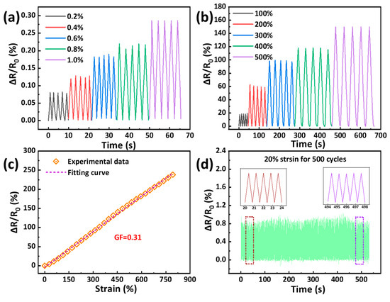 Relative resistance changes of the G220U300-S22.5 hydrogel sensors in response to (a) small strains (0.2–1%) and (b) large strains (100–500%). (c) Relationship between relative resistance change and strain of the hydrogel sensor. (d) Relative resistance change of the hydrogel sensor during 500 cyclic tests at a maximum strain of 20%.