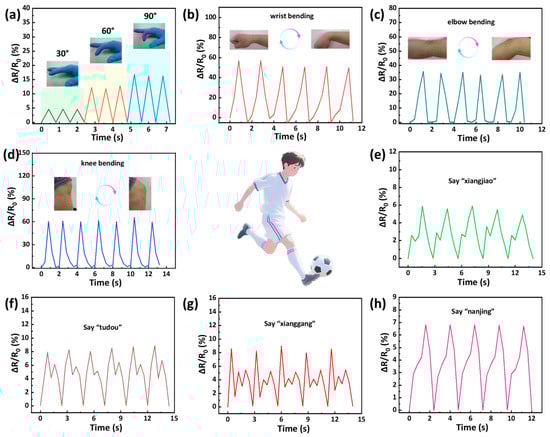 Real-time relative resistance changes of hydrogel sensors for monitoring both large and subtle human movements: (a) finger bending at various angles (30°, 60°, and 90°); (b) wrist bending; (c) elbow bending; and (d) knee bending. (e–h) The application of hydrogel-based sensors in detecting the pronunciation of various words.