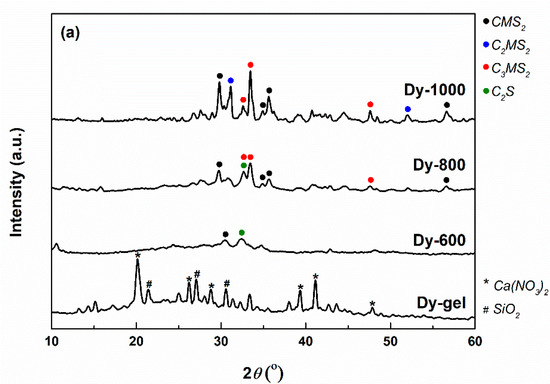 Starting from diopside, akermanite and merwinite compositions and employing the sol–gel method, crystalline ceramics were obtained after applying thermal treatments at different temperatures. If the powders calcined at 600 °C were in an incipient state of crystallization, mainly given by the dicalcium silicate binary compound, the materials thermally treated at higher temperatures (800, 1000 and 1300 °C) displayed distinct phase compositions as a result of multiple and competitive solid-state reactions defined by specific thermodynamic conditions. Only the sample corresponding to Dy composition presented diopside as the leading crystalline compound, while Ak composition ended up as a balanced mixture of diopside, akermanite and merwinite and Mw composition exhibited a majority of dicalcium silicate.