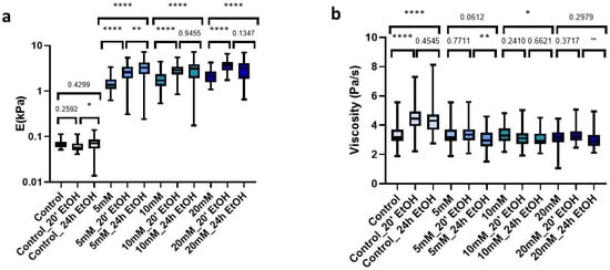 The improved mechanical properties due to genipin made our dECM hydrogels suitable candidates for use as cell culture scaffolds. However, the required use of sterilant on the matrix prior to cell culture may induce changes in the mechanical rigidity. Accordingly, we studied the changes in stiffness and viscosity of hydrogels both with control and genipin-crosslinker under short and long time periods (20 min and 24 h) with a 70% EtOH solution. For this, we first measured the hydrogels prior to AFM sterilization. Then, we immersed the hydrogels in the sterilization solution (EtOH 70%) and subsequently performed three washes with 1X PBS and proceeded to measure them again. The uncrosslinked matrices did not experience significant changes with any of the sterilization times (Figure 6a); however, they did experience significant changes in viscosity (p < 0.0001) with both treatments (Figure 6b). In contrast, all hydrogels to which we added crosslinker experienced significant changes (p < 0.001) in stiffness, which was dependent on sterilization time. For genipin-crosslinked hydrogels, they experienced a gradual time-dependent increase in stiffness as compared to their fresh counterparts (Figure 6a). As for the viscosity of the crosslinked matrices, we could observe that treatment with 70% EtOH for 20 min did not produce significant changes in any of them (5 mM (p = 0.771), 10 mM (p = 0.241), and 20 mM (p = 0.371)). In addition, for longer sterilization periods (24 h), viscosity was only significantly affected (p = 0.0419) in the 10 mM matrices, while in the rest we could observe that there were no significant changes compared to non-sterilized crosslinked hydrogels (Figure 6b).