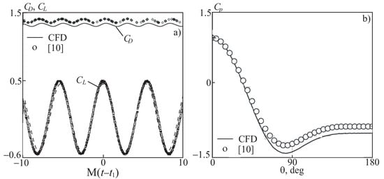 The distributions of the lift coefficient, drag coefficient, and pressure coefficient are shown in Figure 4. The lines correspond to the numerical simulation data, the symbols ∘ correspond to the data of []. It achieves good agreement with the available data for all characteristics.