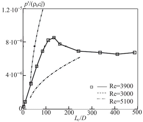RMS pressure distributions obtained using various approaches are shown in Figure 7. The control surface is located at , and the observation point—on a circle with radius . Symbols ◻ correspond to simulation results, dash-dotted line—experimental data [] at , double dash-dotted line corresponds to experimental data [] at . Good agreement between the calculated and experimental data takes place at .