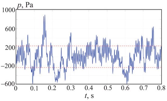 The presented fields of physical quantities illustrate the general picture of the separated flow near the cylinder. As quantitative estimates of the accuracy of solving this problem, the most interesting are the spectra of pressure fluctuations on the cylinder surface and acoustic loads on the pipe walls. At each point on the wall, as well as at some selected points, the Fourier transform of the data is performed, expressing the dependence of pressure on time. The time dependence of overpressure on the pipe wall is shown in Figure 11 at m. Dotted lines show pressure levels corresponding to Pa.