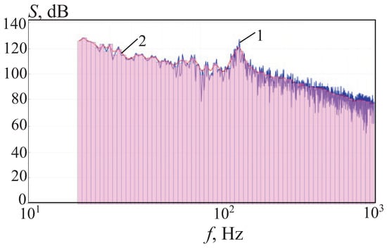 The Fourier transform of the pressure signal at the same point is shown in Figure 12. Line 1 shows the results of calculations, line 2—smoothed spectrum, and columns—results of calculations using the filter. A peak with a frequency corresponding to the fundamental tone of the pulsations stands out well.
