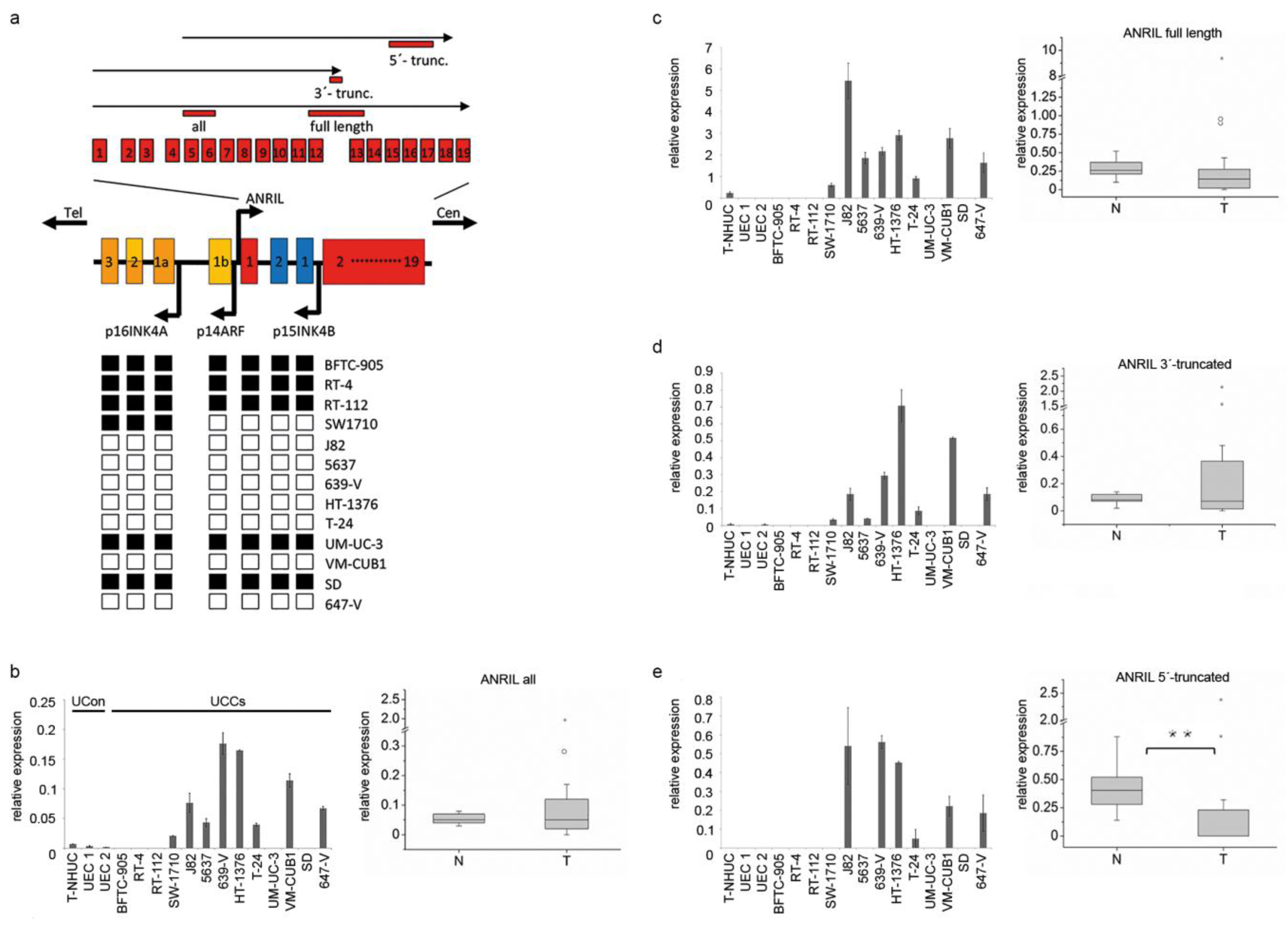 (a) Illustration of the INK4/ARF locus on chromosome 9p21 encoding for the three tumor suppressors (TS) p14ARF, p15INK4B, p16INK4A and for the lncRNA ANRIL. ANRIL and p14 share a bidirectional promoter. The full length ANRIL transcript contains 19 exons. Black arrows on top represent different groups of truncated variants and the localization of primer assays is given by red bars. Black and white boxes at the bottom represent the exons of the three TS. Black boxes denote deletions as determined previously by Florl et al. [4], white boxes display retentions. (b) ANRIL expression across all kind of isoforms was determined in UC cell lines (left graph, bar chart) and tissues (right graph, boxplot representation) with the “all” assay by quantitative RT-PCR. Expression was normalized to the TBP reference gene. The cell lines comprised 13 UC cell lines (UCCs) and three normal controls (UCon), one immortalized normal cell line (TERT-NHUC) and two different primary cultures of normal uroepithelial cells (UEC). The tissue sample set 1 comprises 19 UC tissues (T) and 10 normal bladder tissues (N). In an analogous fashion, expression of full length variants (c), a group of 3’-truncated (d) and a group of 5’- truncated isoforms (e) was determined in the cell lines and tissues. (** p ≤ 0.01).