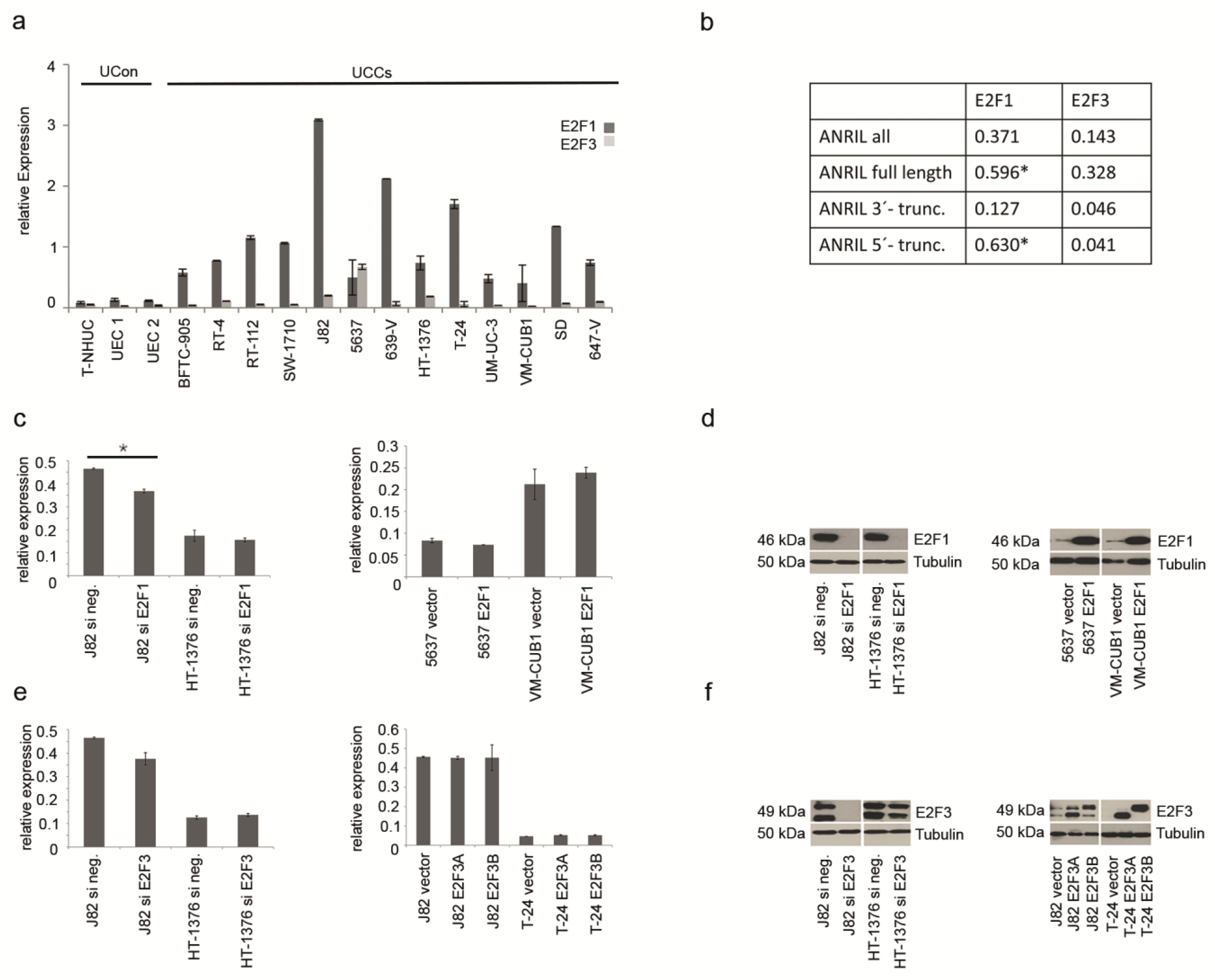 To further elucidate the effect of both transcription factors on ANRIL expression, E2F1 and E2F3 expression was modulated either by siRNA-mediated knockdown or by ectopic expression in five different UC cell lines. Although ectopic expression and siRNA knockdown were highly efficient (Figure 2d,f), neither increased nor decreased expression of E2F1 or E2F3 resulted in prominent changes of ANRIL expression (Figure 2c,e). The only significant change was observed upon downregulation of E2F1 in J82 cells (Figure 2c, p ≤ 0.05). This cell line displayed the highest expression levels of ANRIL and of E2F1. Complete loss of E2F1 protein expression (Figure 2d) resulted in reduced ANRIL expression (Figure 2c), concurring with the results from correlation analysis indicating a positive relation between both molecules.