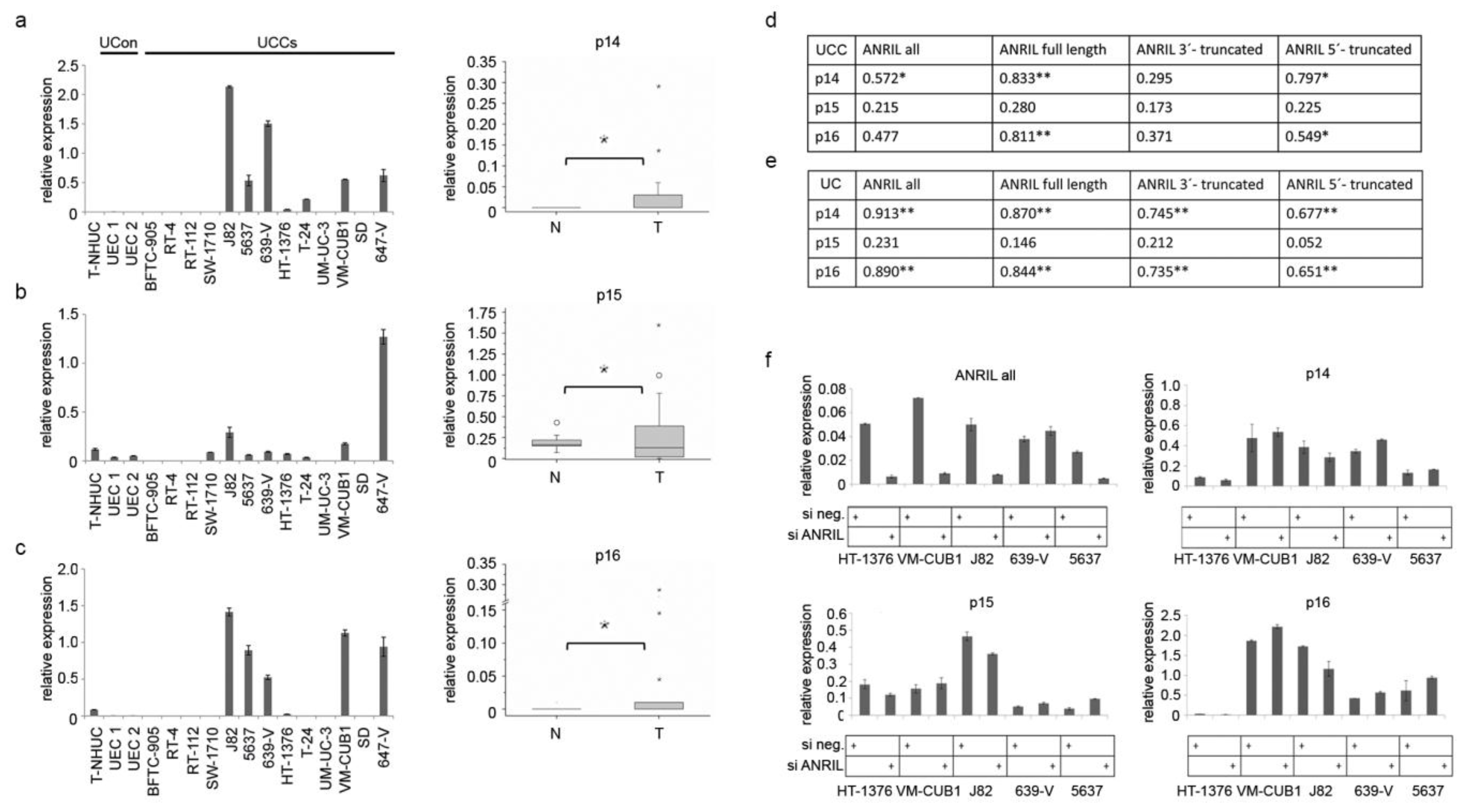 Next, we sought to explore the regulatory functions of ANRIL in UC, especially those of the truncated isoforms. To determine the impact of ANRIL on transcriptional activity of the three TS encoded by the INK4/ARF locus, we established the expression profiles of p14, p15 and p16 in UC cell lines and tissues compared to normal controls (Figure 3a–c).