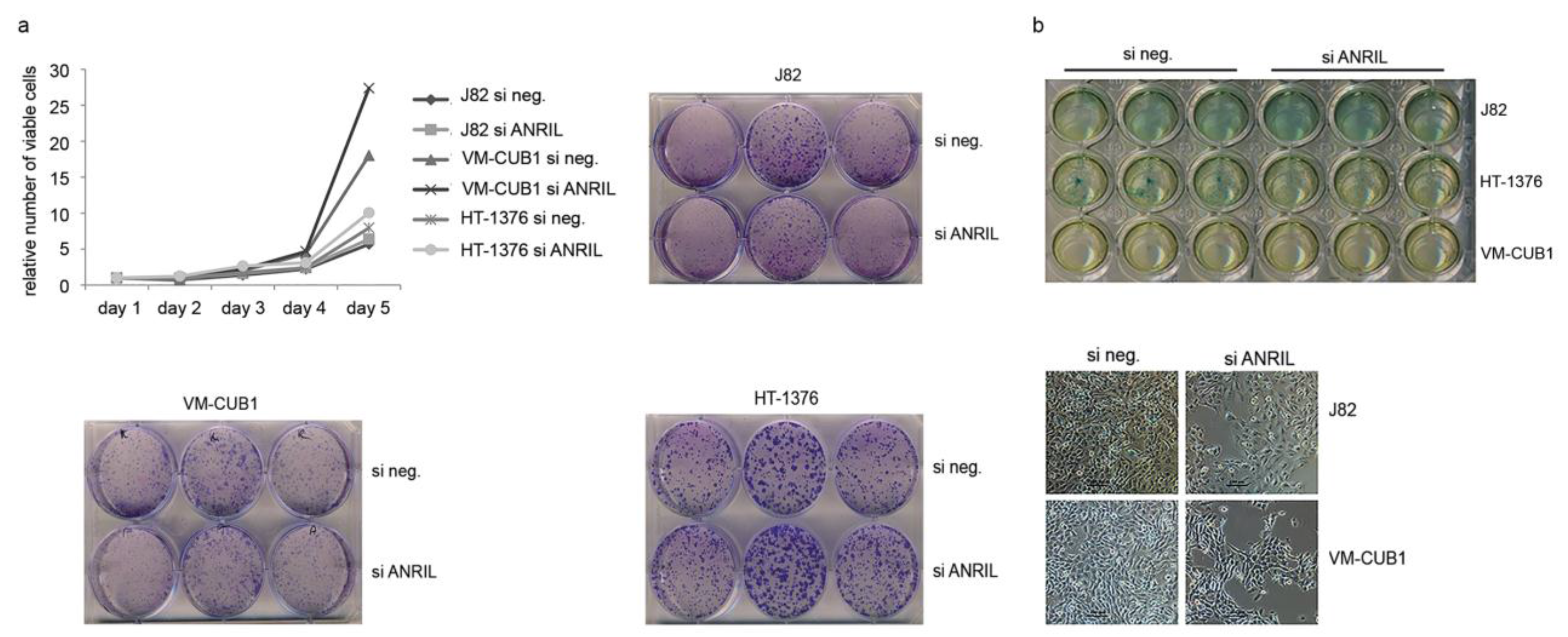 ANRIL knockdown (Figure S2c) elicited neither significant changes in proliferation (Figure 4a top left panel) and clonogenic capacity (Figure 4a), nor in the abundance of senescent cells (Figure 4b) in three UC cell lines.
