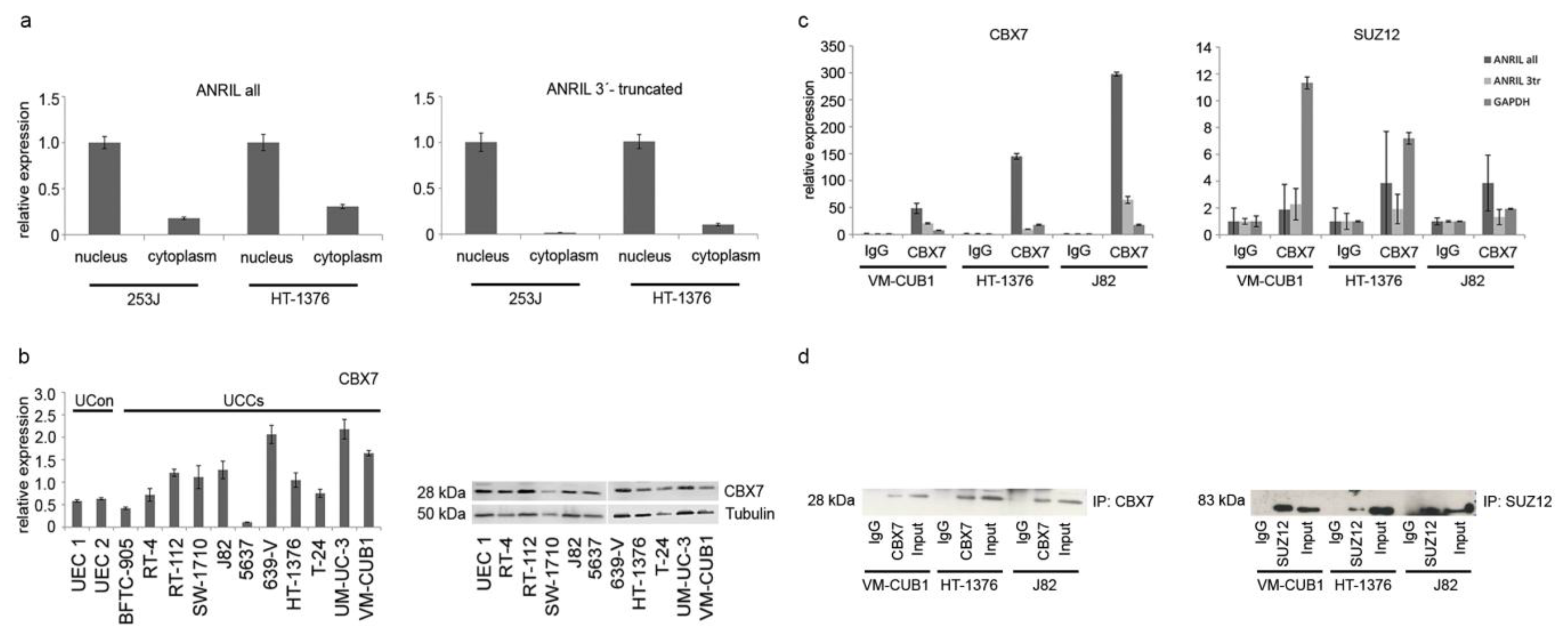 Established protein interaction partners of ANRIL are CBX7 in PC-3 cells and SUZ12, e.g. in WI38 cells. We already observed in our previous study on the function of lncRNA HOTAIR in UC [35] that SUZ12 is overexpressed in all investigated UC cell lines compared to normal urothelial cells. Likewise, CBX7 was significantly overexpressed in 7/11 UC cell lines (Figure 5b). Thus, with the exception of 5637 cells, four of the five cell lines that were used to study the regulatory effects of ANRIL by knockdown experiments displayed high abundance of both known interaction partners of ANRIL.