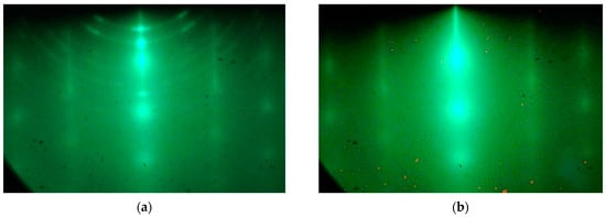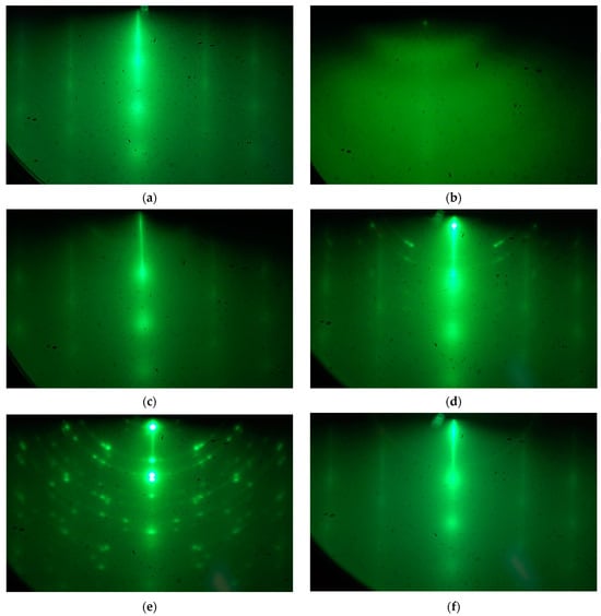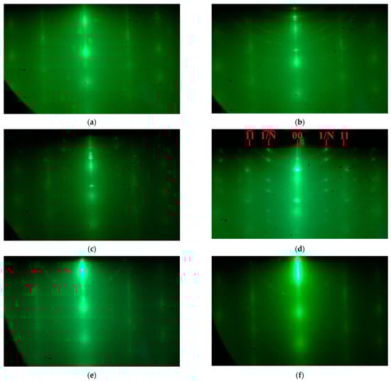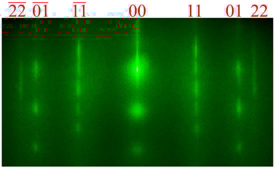 Ge growth on HOPG was carried out at temperatures of 100–720 °C at a germanium deposition rate of 0.02 mL/s. Before each growth process, the HOPG substrate was annealed at 800 °C for 5 min. It was found that, at a temperature of 800 °C, germanium atoms desorbed from the substrate and the surface were restored to pure HOPG, as evidenced by the characteristic diffraction patterns of clean HOPG surface, as shown in Figure 4a.