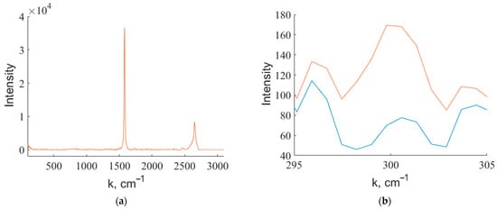 Finally, Figure 8a shows the Raman spectra of the sample with 10 mL germanium on the surface of HOPG, grown at 400 °C. Figure 8b compares the Raman spectra of a HOPG sample (blue curve) and the 10 mL Ge/HOPG sample (orange curve) near the point k = 300 cm−1. Due to the small values of the signal, it was necessary to use a special technique for analyzing Raman spectra, developed by the authors []. As a result, the presence of small peaks near 296, 300, and 304 cm−1, corresponding to germanium, was established. This is consistent with the previous report on germanene, where Jung et al. revealed a Raman band at 296 cm−1 in a germanene sample []. This line was also predicted theoretically by Kukucska et al. []. The rest of the spectrum corresponded to the spectrum of the HOPG substrate. Low-frequency (7–200 cm−1) Raman spectra of the studied samples did not reveal any features (Figure S5).