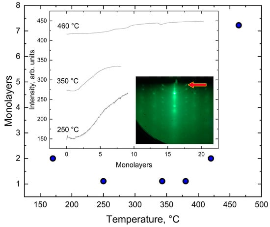 The dynamics of changes in the intensity of N reflections for different temperatures are nonlinear (Figure 9). Figure 9 shows the dependence of the moment of the appearance of an additional 1/N reflection on the substrate temperature when Ge is deposited on HOPG. The inset to Figure 9 shows the dependence of the local intensity of the diffraction pattern at the point of formation of the 1/N reflection on the effective thickness of the deposited germanium on the HOPG surface (which is proportional to the growth time). The Ge growth rate for all curves was the same, equal to 0.02 mL/s. From this graph, it is clear that, at temperatures below 450 °C, the 1/N reflection appears at an effective thickness of the deposited material of about 1 mL. Then, during the deposition of several monolayers, the intensity of this reflection reaches its maximum stationary value. The absolute intensity value for all curves is approximately the same, and, in the graph, the curves are shifted for clarity. The 1/N reflections persist for a sufficiently large number of deposited layers.