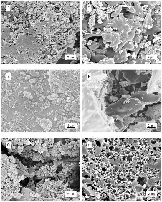 SEM images of Raw-ADC (low magnification (A) and high magnification (B)), H2SO4-ADC (C), H3PO4-ADC (D), HNO3-ADC (E), N-ADC (F), Fe-ADC (G), and KOH-ADC (H).