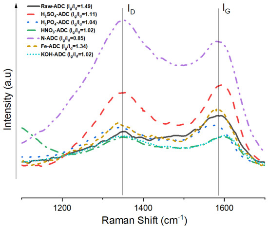 Raman spectroscopy was used to study the carbon structure of all the ADC samples (Figure 2). In Raman spectroscopy, the band between 1598 and 1575 cm−1 (G-band) is attributed to the organized carbon structure, while the band between 1355 and 1330 cm−1 (D-band) is attributed to the disordered carbon structure. Thus, a higher intensity ratio of IG/ID indicates more sp2 hybridized ordered carbon structures in corresponding carbon materials. Among all the studied ADCs, the Raw-ADC exhibited the highest IG/ID ratio of 1.47, implying the presence of the highest level of the ordered graphitic phase in the Raw-ADC. Compared to the Raw-ADC, the activation and doping resulted in reduced IG/ID ratios, i.e., more defective carbon structures, with N-ADC having the lowest IG/ID ratio of 0.85, showing the most defective carbon structure. Basically, the defective carbon structure is a result of carbon etching caused by activation and doping.