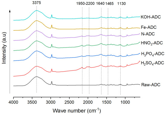 FTIR analysis was carried out to study the chemical functional groups of the as-synthesized ADC (Raw-ADC in Figure 3). The Raw-ADC showed a broad and strong IR peak around 3375 cm−1, which can be attributed to the stretching vibrations of O–H and/or N–H. The peaks observed between 2800 and 3000 cm−1, as well as 1460 and 1380 cm−1, represent C–H vibrations. The relative broad peaks observed around 1630 cm−1 and 1560 cm−1 could be attributed to Amide I and II and/or aromatic C=C stretching vibrations. The peaks in the range of 1100 and 1170 cm−1 could be attributed to C–O–C and/or C–O stretching vibrations. The peaks in the range of 1300 and 1350 cm−1 could be attributed to aromatic C–N stretching and/or O–H bending. After activation and doping, except for Fe-ADC, all the ADC materials showed new peaks in the range of 1950–2200 cm−1 (Figure 3), indicating oxidized functional groups like C≡C, C=C=C, C=C=O, and C=C=N, as well as aromatic compounds. This could be attributed to the oxidation and removal of amorphous carbon structures.