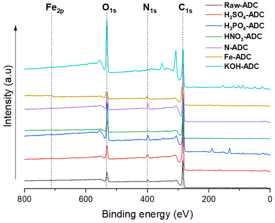 XPS was further carried out to analyze the surface element composition and bonding of all the ADC materials (Figure 4 and Table 1). The full XPS survey indicated that Raw-ADC already contained a significant amount of the N element. Activation and doping generally increased the amount of the N element, except for HNO3 and KOH. Interestingly, Fe doping resulted in the largest amount of the N element. Particularly, KOH activation led to the smallest amount of the N element, the largest amount of the O element, and the smallest amount of the C element. Since N bonding, including pyridinic N, pyrrolic N, quaternary N, and oxidized N, can have significant effects on the electrochemical performance of the carbon electrode material in supercapacitors [], high-resolution N1s XPS spectra were obtained and analyzed (Table 2 and Figure S1). The N1s peak of ADCs can be deconvoluted into four peaks at 398.5 ± 0.5, 399.5 ± 0.5, 400.5 ± 0.5, and 403 ± 0.5 eV, which correspond to pyridinic N, pyrrolic N, quaternary N, and oxidized N, respectively []. It was found that the Raw-ADC did not contain any pyrrolic N, while KOH-ADC demonstrated the highest relative proportion of pyrrolic-N (85%), followed by HNO3-ADC.