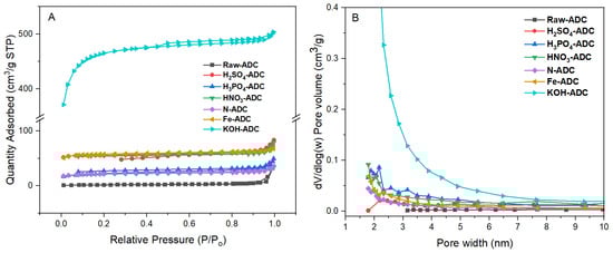 The specific surface area and porosity characteristics of all the ADCs were obtained from the BET surface area analysis (Figure 5 and Table 3). All the ADCs displayed type H4 hysteresis loops, implying the existence of micro- and meso-porous structures. The Raw-ADC, however, did not contain any micropores and showed a low specific surface area of 5.85 m2/g, indicating limited porous structure. Compared to the Raw-ADC, the processes of activation and doping increased micropore and mesopore volumes, as well as the specific surface area, which is consistent with the break of particles and surface roughness as observed from SEM. Among all the ADC materials, H3PO4 activation and melamine treatment for N doping resulted in the least pore development, while KOH-ADC exhibited a marvelous pore structure development with the smallest average pore size (2.20 nm), the largest pore volume (0.1716 cm3/g), and the largest specific surface area (1418 m2/g), indicating the most efficient carbon etching and consequent pore formation. The largest micropore and mesopore volume from KOH activation could be attributed to the CO or CO2 generation [], as well as the intercalation mechanism by metallic K within the carbon framework, leading to the widening of pores during the high temperature decomposition process [].