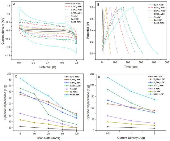 The Raw-ADC showed relatively poor electrochemical performance as supercapacitor electrode material. It showed a specific capacitance of 24.4 F/g in the CV test at a scan rate of 5 mV/s and a specific capacitance of 16.6 F/g in the GCD test at a current density of 0.5 A/g. All the activation and doping processing resulted in ADCs with larger specific capacitances, but the N-doping and Fe-doping processing led to less improvement than that of the activation. Compared to the Raw-ADC, the Fe-ADC and N-ADC exhibited 2.3-fold and 3.9-fold specific capacitances, respectively, while the H2SO4-ADC, H3PO4-ADC, and HNO3-ADC demonstrated 7.1-fold, 8.1-fold, and 10.9-fold specific capacitances, respectively. Particularly, the KOH-ADC presented the greatest improvement in specific capacitance, which reached 234.5 F/g during the GCD test at a current density of 0.5 A/g, i.e., 14.1-fold specific capacitance with respect to that of Raw-ADC. This result is better than the reported electrochemical performance of related carbon electrode materials from hydrothermal liquefaction processing of other biomass such as corn stover [], pine wood [], and larch wood []. It is noteworthy that the KOH-ADC exhibited 50% more specific capacitance than that of the carbon electrode materials from pyrolysis of the same microalgae [].