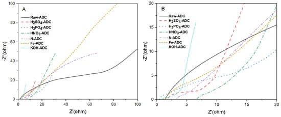 Nyquist plots of all the ADC electrode materials (A) and their views in a high frequency region (B).
